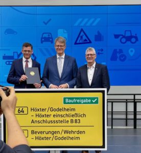 Am gestrigen Dienstag, den 2. Dezember 2025, erteilte Bundesverkehrsminister Patrick Schnieder feierlich die Baufreigaben für alle baureifen Bundesstraßen- und Autobahn-Neuprojekte in Deutschland. Mit dabei sind die lang ersehnten heimischen Projekte (1) B 64 – Höxter/Godelheim – Höxter einschließlich Anschluss B 83 und (2) B 83 – Beverungen/Wehrden – Höxter/Godelheim. Der heimische Bundestagsabgeordnete Christian Haase MdB nahm die Baufreigaben in der Feierstunde im Bundesverkehrsministerium entgegen.