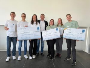 Die Gewinner:innen von Platz 2 und Platz 3 des diesjährigen Trophelia-Ideenwettbewers aus dem Fachbereich Life Science Technologies der TH OWL mit Professor Ulrich Müller (M.) präsentieren stolz ihre Preise. Foto: TH OWL