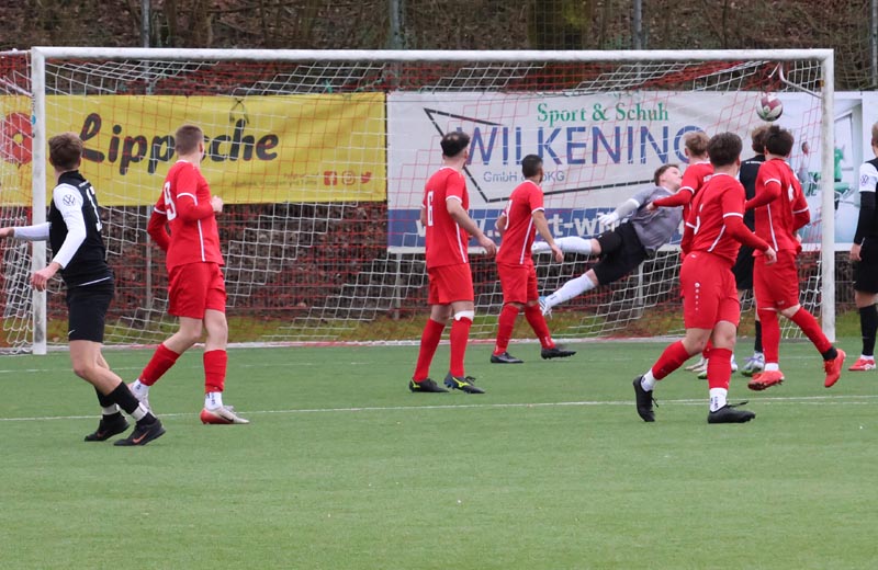 In der 16. Minute wurde es erstmals gefährlich vor unserem Tor. Nach einer Ecke auf den zweiten Pfosten legte ein Spieler der Gastgeber per Kopf in die Mitte ab, wo Salepp Jaromir Kowarsch aus kurzer Distanz zum Abschluss kam, doch Luca Borcheld reagierte stark und hielt den Ball. Diestelbruch blieb spielbestimmend und drückte uns immer weiter in die eigene Hälfte. In der 34. Minute wurde eine Flanke auf den zweiten Pfosten gefährlich, Jannik Rother kam zwischen unserer Abwehrkette zum Ball, konnte diesen jedoch nicht sauber kontrollieren und setzte ihn neben das Tor.