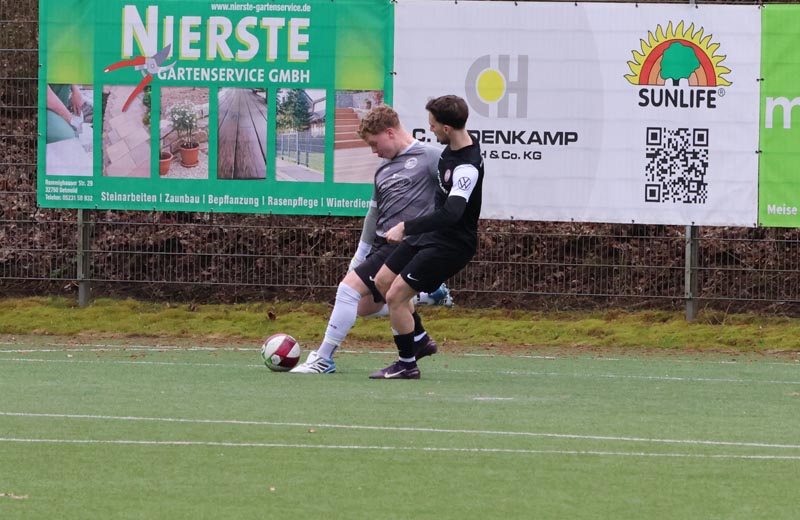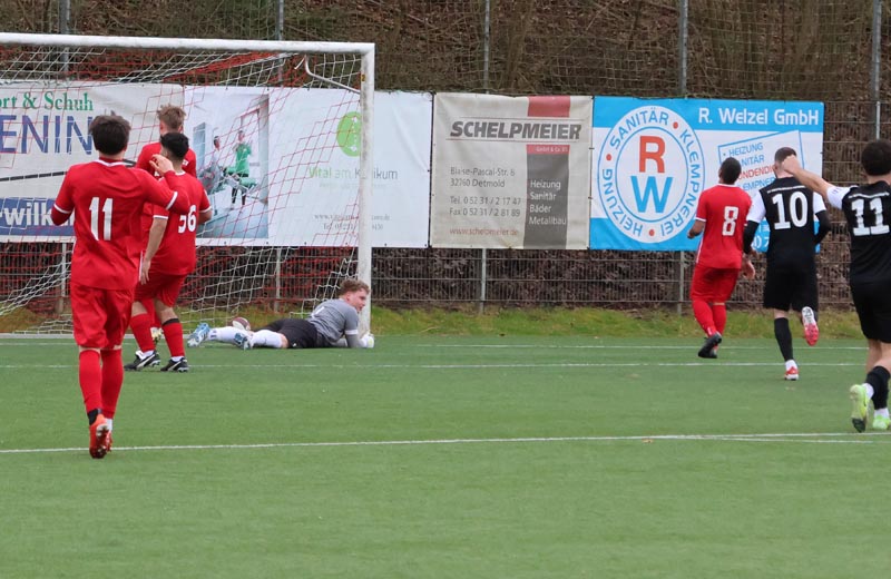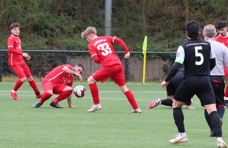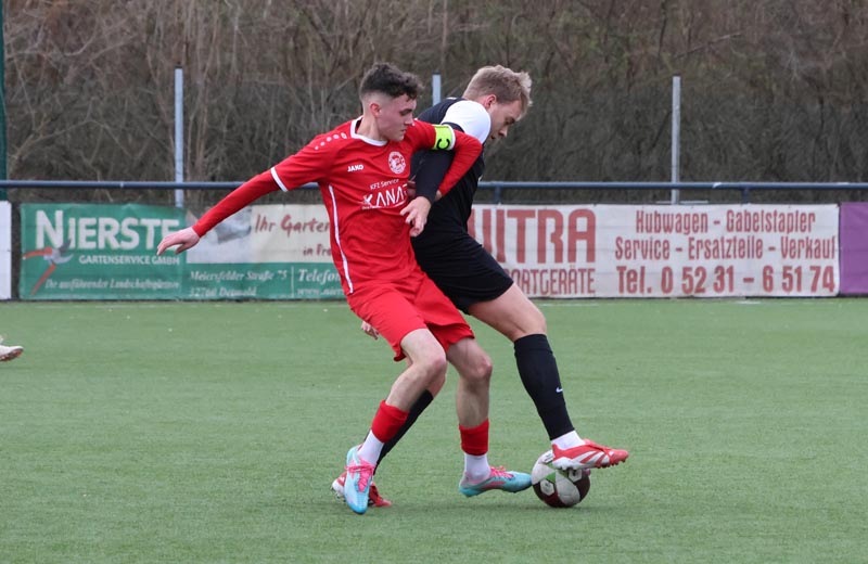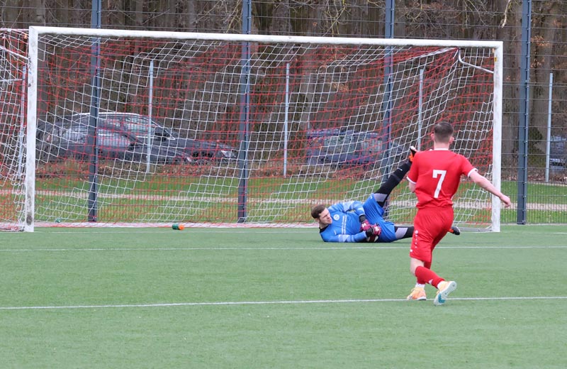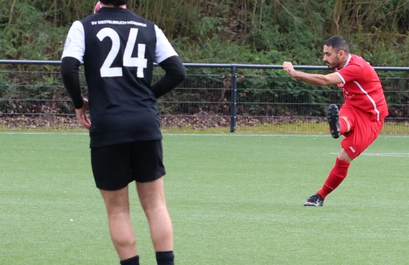 In der 16. Minute wurde es erstmals gefährlich vor unserem Tor. Nach einer Ecke auf den zweiten Pfosten legte ein Spieler der Gastgeber per Kopf in die Mitte ab, wo Salepp Jaromir Kowarsch aus kurzer Distanz zum Abschluss kam, doch Luca Borcheld reagierte stark und hielt den Ball. Diestelbruch blieb spielbestimmend und drückte uns immer weiter in die eigene Hälfte. In der 34. Minute wurde eine Flanke auf den zweiten Pfosten gefährlich, Jannik Rother kam zwischen unserer Abwehrkette zum Ball, konnte diesen jedoch nicht sauber kontrollieren und setzte ihn neben das Tor.