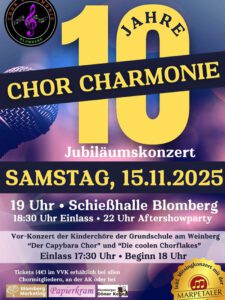 Das Jubiläums-Konzert von Charmonie mit Chorband und den Lieblingsstücken aus den letzten zehn Jahren beginnt um 19.00 Uhr (Einlass ab 18.30 Uhr). Und abschließend sind dann auch die Zuschauer gefragt: zusammen mit der befreundeten Marpetaler Blaskapelle gibt es ein Mitsingkonzert, bei der die Schießhalle sicherlich zum „Beben“ gebracht wird. Danach darf gerne auf der Aftershowparty weiter gefeiert werden.