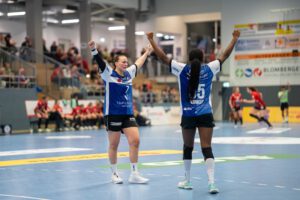 v.l. Diana Magnusdottir (HSG Blomberg-Lippe, #07) und Farrelle Njinkeu (HSG Blomberg-Lippe, #55) jubeln nach einem Tor