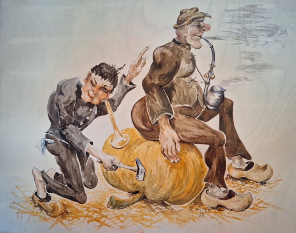 Solch ein Wunder der Natur aber hatten die Mossenberger all ihr Lebtag noch nicht gesehen. So standen sie, und es kamen immer noch mehrere hinzu, reckten die Hälse und konnten gar nicht genug staunen über diese Riesenfrucht. Nun fiel es dem Fremden noch obendrein ein zu sagen, das wäre ein Eselsei, das da neben ihm läge. Da war des Wunderns kein Ende unter den Mossenbergern und der Allerklügste hatte schnell ausgerechnet, aus einem Eselsei müsste doch ein Esel rauskommen. Solch ein Langohr könnte gewiss dem ganzen Dorfe von großem Nutzen sein.