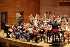 Probensituation mit beiden Hochschulorchestern auf der Bühne des Konzertsaals der Karol Szymanowski Musikakademie sowie Gesangssolistin Gerhild Romberger und Gastdirigent Patrick Lange © HfM Detmold/Plettenberg
