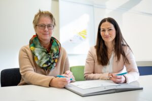 Unterzeichnen die neuen Zielvereinbarungen für das Lüttfeld-Berufskolleg: Andrea Brasch (links) und Karen Zereike. Foto: Kreis Lippe