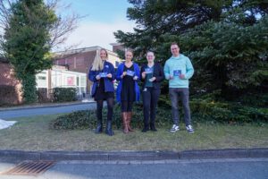Von links: Irina Hellmig (Gesellschaftliches Engagement | SCP07), Michaela Kretzschmar (Pflegedienstleitung | Frauen- und Kinderklinik St. Louise), Miriam Adediwura (Kommunikation & Marketing | Frauen- und Kinderklinik St. Louise) und Marco Mühlfeld (Koordinator Merchandising | SCP07) bei der Übergabe der Schnuller vor der Klinik.