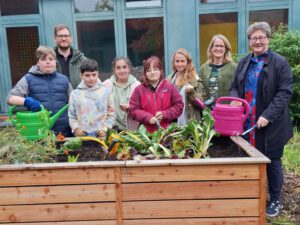 Hier haben Förderschülerinnen und -schüler im Rahmen ihres Lebenspraktischen Trainings zwei neue Hochbeete angelegt, in die sie jetzt Spinatsetzlinge gepflanzt und Knoblauchzehen gesteckt haben. Noch in diesem Jahr hoffen sie auf die erste Spinaternte – gekocht wird dann gemeinsam in der Schulküche. Finanziert wurde das Projekt durch die Umweltstiftung Lippe, dank deren Förderung zwei Hochbeete gebaut und neue Gartengeräte angeschafft werden konnten.