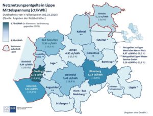 Die IHK Lippe hat verschiedene Abnahmefälle von Sondervertragskunden auf Niederspannungs- bzw. Mittelspannungsebene in Lippe und benachbarten Verteilnetzgebieten betrachtet. Unternehmen in Lippe, die Strom auf der Mittelspannungsebene beziehen, zahlen mit durchschnittlich 5,54 Cent pro Kilowattstunde 18,4 Prozent weniger als 2025. Das Netzentgelt auf der Niederspannungsebene beträgt in Lippe im Schnitt 9,37 Cent/kWh und sinkt damit im Vergleich zum Vorjahr um 9,9 Prozent.