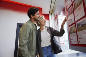 Paar liest Immobilienangebote in der Filiale