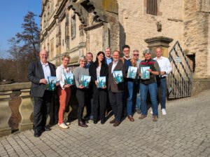 Mit Verbandsvorsteher Jörg Düning-Gast (5.v.r) sowie Robin Wagener (MdB, Fraktionsvorsitzender Bündnis 90/Die Grünen in der Verbandsversammlung, 4.v.r.) sowie Falk Niehage (stellv. SPD-Fraktionsvorsitzender in der Verbandsversammlung, 3.v.r.) freuen sich die Kolleginnen und Kollegen über den Jahresbericht des Landesverbandes Lippe für das Jahr 2025 (v.l.): Andreas Tewes (Fachbereichsleiter Personal & Organisation), Silvia Herrmann (Leiterin Weserrenaissance-Museum und stellv. Leiterin Lippisches Landesmuseum), Peggy Pfaff (Pressereferat), Marcos Canosa (Kämmerer), Dr. Mayarí Granados (stellv. Leiterin Kulturagentur), Jochen Brunsiek (Leiter Kulturagentur), Susanne Hoffmann (Leiterin Forstabteilung) und Dirk Wemhöner (Finanzabteilung). (Foto: LVL)