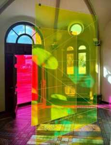Die installativen und bildhauerischen Arbeiten von Antje Blumenstein stellen Flächen, Linien, Farben, Licht und Transparenz in den Fokus. Die Künstlerin interpretiert die Räume des Eichenmüllerhauses u.a. mit fluoreszierendem Acrylglas neu und schafft ein vielschichtiges Raumerlebnis.