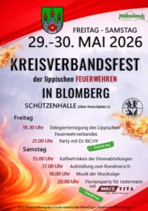 Am Freitag, den 29. und Samstag, den 30. Mai, lädt der Förderverein der Freiwilligen Feuerwehr Blomberg E. V. zum Kreisverbandsfest der lippischen Feuerwehren in Blomberg in die Schützenhalle (Alter Dreschplatz 2) ein.