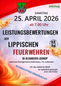 Der Förderverein der Freiwilligen Feuerwehr Blomberg E. V. lädt am Samstag, den 25. April 2026, ab 7.00 Uhr rund ums Dorfgemeinschaftshaus / Fa. Lehmann zu Leistungsbewertungen der Lippischen Feuerwehren in Blomberg – Donop ein. Für das leibliche Wohl (unter den Eichen) ist natürlich gesorgt! Schaulustige sind herzlich willkommen.