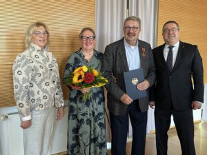 Freuen sich mit dem Geehrten Christian Petschick über dessen Auszeichnung (von links): Lemgos stellvertretende Bürgermeisterin Andrea Freitag, Ingrid Petschick und Landrat Dr. Axel Lehmann. FOTO: Kreis Lippe
