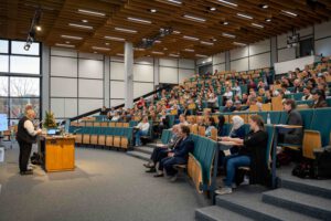 Rund 250 Teilnehmende verfolgen das TKW-Symposium im Hörsaal: Fachleute, Studierende und Lehrende diskutieren aktuelle Entwicklungen in der Technologie der Kosmetika und Waschmittel. Foto: TH OWL