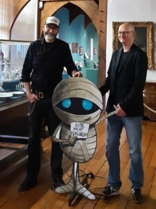 Christian Tielmann (rechts) und André Sedlaczek (links) im Lippischen Landesmuseum Detmold mit der kleinen Mumie – der Hauptfigur ihrer humorvollen Kinderbuchlesung. / Foto: Lippisches Landesmuseum