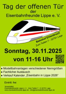 Die Eisenbahnfreunde Lippe e. V. laden am Sonntag, 30. November 2025 (1. Advent) zum Tag der offenen Tür in ihr Vereinsheim, das ehemalige Stationsgebäude des Bahnhofs Ehlenbruch ein. Hier werden gleich mehrere Anlagen der Öffentlichkeit vorgeführt. Unsere Modellbahner haben die vergangenen Monate genutzt, um an verschiedenen Projekten weiterzuarbeiten: