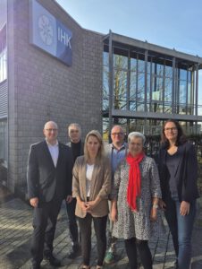 Diskutierten angeregt mit den Gästen: Martin Raithel (IHK Lippe), Michael Hanschmidt (Büro für Zukunft (Köln)), Antje Bröhl (Schulleiterin Gertrud Bäumer Realschule Gelsenkirchen Mitte), Dirk Menzel (Lippe Bildung eG), Irmgard Weishaupt (Leiterin Regionale schulpsychologische Beratung Lippe) und Dr. Claudia Böhm-Kasper (Kreis Lippe) (v.l.n.r.). Bildquelle: IHK Lippe