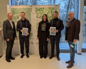 Philipp Rösner ((2. v.r.) Landschaftsarchitekt, Bauforum Berlin GmbH), Isabella Rösner ((m.). Landschaftsarchitektin, Bauforum Berlin GmbH) und Prof. Dipl. Ing. Philipp Quack ((2.v.l.) Architekt, ARQ Architekten Rintz und Quack GmbH) freuen sich über den 1. Preis beim Realisierungswettbewerb. Jörg Düning-Gast ((l.) Verbandsvorsteher Landesverband Lippe) und Thomas Lammering ((r.) Technischer Beigeordneter der Stadt Detmold) gratulieren recht herzlich. (Foto: LVL)