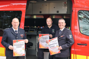 Wehrführer Stadtbrandinspektor Joachim Hartfelder, Brandoberinspektor Dennis Rubart (Pressesprecher) und Stadtbrandinspektor Heiko Mühlenmeier (stelv. Wehrführer) stellen die vorläufigen Plakatentwürfe vor.