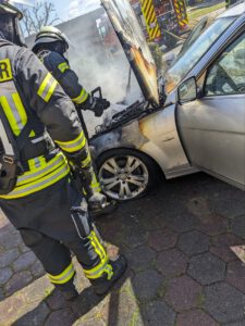 Aus bislang unbekannten Gründen geriet ein PKW, in der Straße Birkenweg im Ortsteil Reelkirchen, in Brand. Sofort nahm ein Trupp unter Atemschutz mit einem C-Rohr die Brandbekämpfung auf. Dennoch brannte der Motorraum völlig aus. Im weiteren Verlauf musste mit einem Spreitzer der Zwischenraum zwischen Motor und Innenraum geöffnet werden, um letzte Glutnester ablöschen zu können. Zusätzlich mussten Ölsperren im Bereich des Regenrückhaltebeckens installiert werden, Betriebsstoffe ausgelaufen waren. Betriebsstoffe wurden mit Bindemittel abgestreut und aufgenommen.