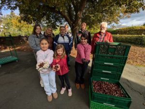 Freuen sich über das leckere Futter fürs Damwild: Die Mädchen Alja Gün, Melda Ünal und Salma Ali (vorn, v.l.) sowie (hinten, v.l.): Olha Bratus, Funda Gün, Mohamed Scharif Ali, Rainer Wannemüller, Jens Tegtmeier und Hans-Werner Schönlau. Im Hintergrund der prächtige Kastanienbaum. (Foto: LVL)