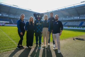 Zum Foto (von links): Wietke Herdejürgen (Kids Club), Amelie Naaff (Kids Club), SCP07-Maskottchen Holli, Chiara Dreßler (CSR | Bewegung & Gesundheit), Christian Strohdiek (Fußballschule) und Dorian Weiß (CSR | Lernort Stadion) freuen sich in der Home Deluxe Arena über die Anerkennung zum freien Träger der Jugendhilfe.