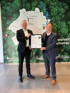 Freuen sich über das TÜV-Zertifikat für das Energiemanagement: Ralf Mattern (rechts), Energiemanagement der Sparkasse und Achim Frohß, (links), Vorstandsmitglied der Sparkasse