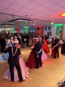 Der Offiziersball des Alten Blomberger Schützenbataillons findet jeweils im Schützenfest-freien Jahr auf dem festlich dekorierten Saal in der Blomberger Schießhalle statt – und dies bereits seit über 60 Jahren. Mit mehr als 250 Besuchern war die Veranstaltung wieder einmal hervorragend besucht und nach kurzer Begrüßung durch Schützenoberst Peter Begemann startete der Ball direkt mit dem Einmarsch der Majestäten. Neben dem amtierenden Blomberger Schützenkönigin Frank II. mit seiner Königin Petra I. und dem gesamten Hofstaat eröffneten auch die Majestäten der Gastvereine aus Großenmarpe, Eschenbruch, Bad Meinberg und Siekholz mit einem Walzer den Offiziersball. Musikalisch begleitet wurde dieser Abend von der Partyband „FrankenKracher“, die es mit ihrer Musikauswahl immer wieder schafften, den Saal zum Tanzen, Mitsingen und Feiern zu animieren.
