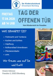 Der Hort Kinderreich veranstaltet am Freitag, dem 17. April 2026, von 14.00 bis 18.00 Uhr einen Tag der offenen Tür. An diesem Tag wollen wir unseren Hort präsentieren, aber auch Spenden sammeln für ein neues Klettergerüst.