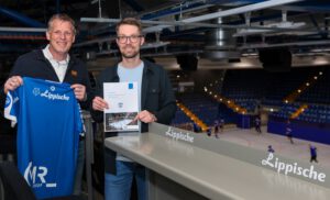 Jörg Zereike, Geschäftsführer des TBV Lemgo Lippe und Steffen Tegeler, Leiter Marketing und Vertrieb beim TBV, betonen: