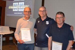 Der emotionale Höhepunkt des Abends war die Verleihung der Ehrenmitgliedschaft an zwei absolute Vereinsurgesteine. Karl-Heinz Hollmann und Christian Rogos wurden für ihre jahrzehntelangen und außergewöhnlichen Verdienste unter großem Applaus der Versammlung ausgezeichnet. Beide haben den TuS in unterschiedlichsten Funktionen nachhaltig geprägt – von der Vorstandsarbeit über die langjährige Leitung der Jugendabteilung bis hin zur Initiierung neuer Vereinsangebote und des langjährigen Jugendturniers (2001-2013).