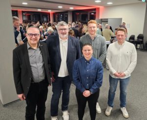 Von links: Bürgermeister Markus Baier, Stadtsportverbandsvorsitzender Alexander Wegner, Boxweltmeisterin Beke Bas, Handballprofispieler und Nachhaltigkeitsbotschafter Nicolai Theilinger und Sportreferent Philip Pauge haben bei der diesjährigen Sportlerehrung über 100 Sportlerinnen und Sportler ausgezeichnet. (Foto: Alte Hansestadt Lemgo)