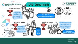 Die Öffentlichkeit wählte ihre Favoriten aus den zuvor von einer unabhängigen Fachjury bestimmten fünf Finalprojekten. Die Top Drei erhielten insgesamt ein Preisgeld von 30.000 Euro, das in die Projekte reinvestiert wird und so zu einer einfachen, flexiblen und klimaneutralen Zukunft des Verkehrs in NRW beitragen soll. Zur Auswahl standen insgesamt fünf zukunftsweisende Verkehrsprojekte für PendlerInnen, den Güterverkehr, für Bus und Bahn, Radfahrende und FußgängerInnen. Zu den weiteren Finalprojekten gehörten auch die „Autofreie Siedlung Köln“ des gemeinnützigen Vereins Nachbarn60 e. V. und das „Mehrfachnutzungspotenzial privater Parkplätze“ der ampido GmbH.